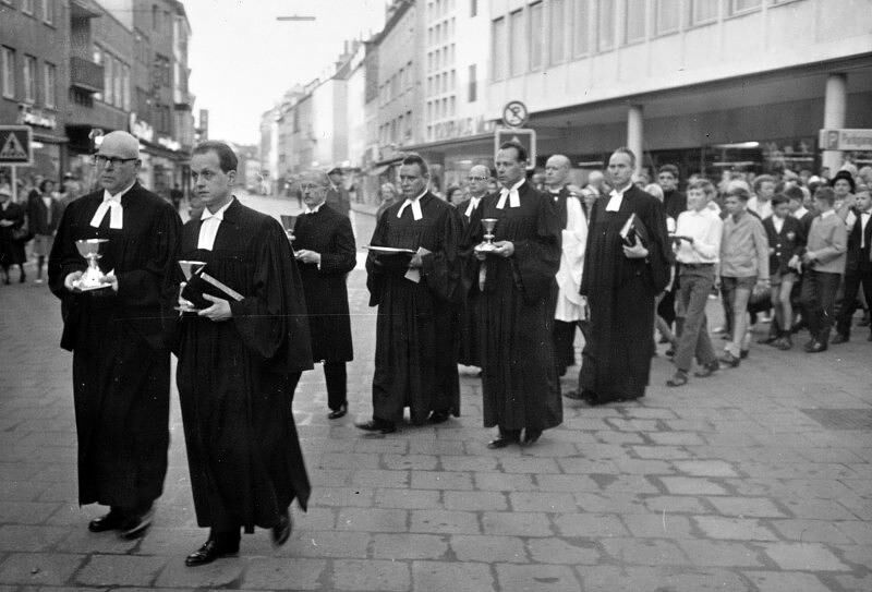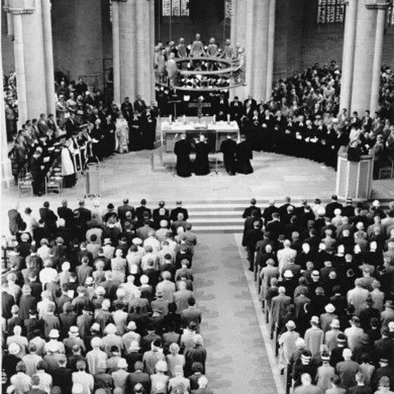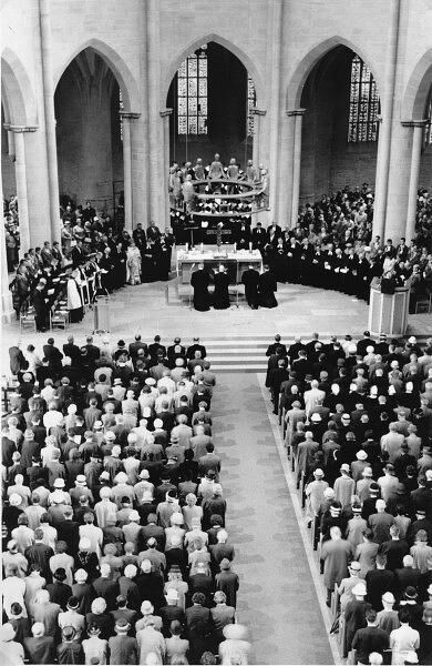 Nach 14 Stufen Aufstieg steht man unter der Orgelempore, und es öffnet sich der Blick in das heutige großartige 28,6 m hohe Sterngewölbe, das mit seinen Rippenstrahlen die einzelnen Raumabschnitte des Hauptschiffes verbindet. Die Seitenschiffe gehen in einen um den Altar führenden Kapellenkranz ( 5 Kapellen) über. Die Bronzekunstwerke im Altarraum wurden von Ulrich Henn, Leudersdorf, Eifel, geschaffen: